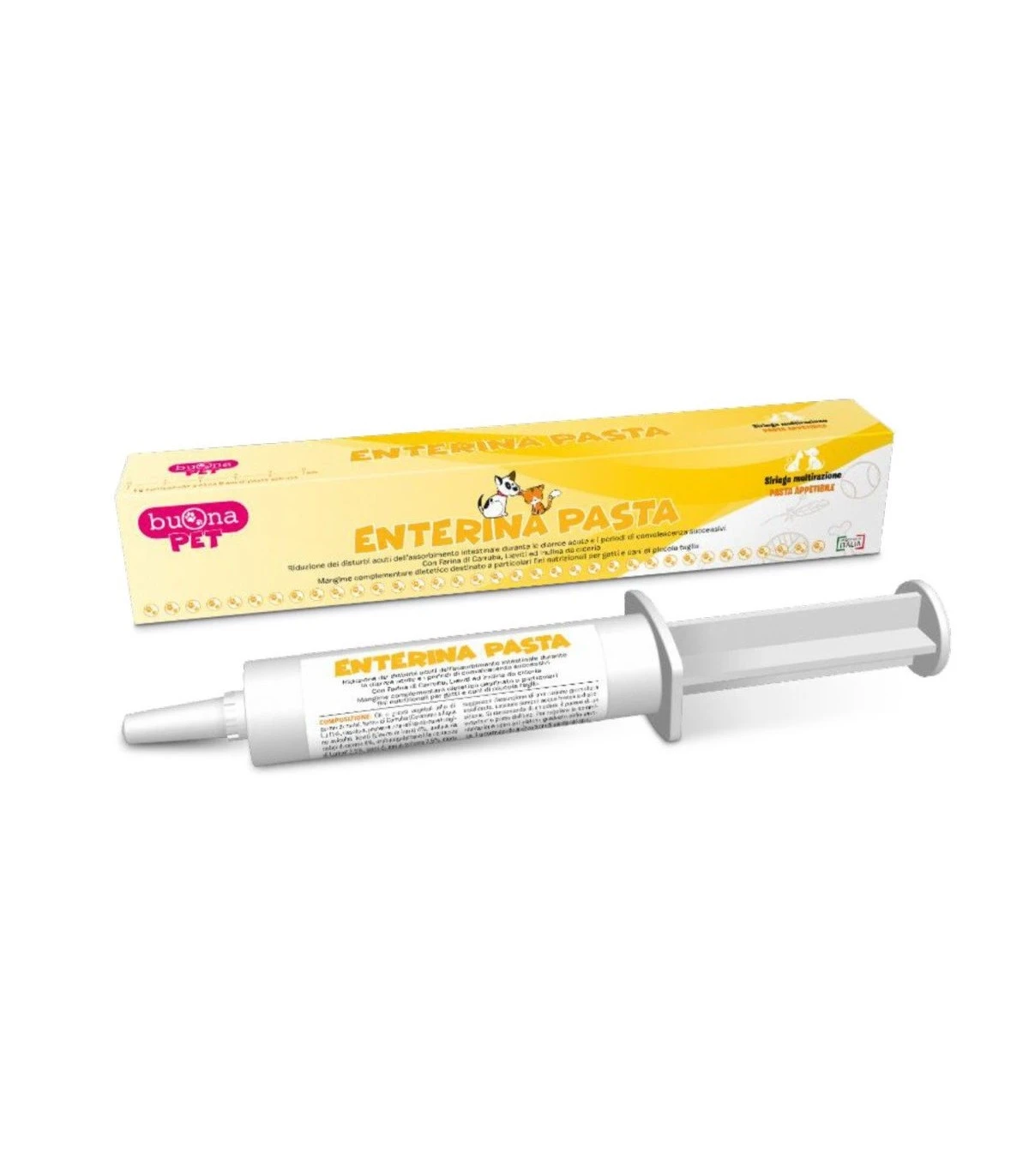 ENTERINA PASTA è formulata appositamente in pasta appetibile per gatti, cani di piccola taglia e cani di taglia toy; con un accresciuto livello di elettroliti, farina di Carruba, lieviti (Lievito di birra), Inulina da radici di cicoria ed ingredienti ad elevata digeribilità.