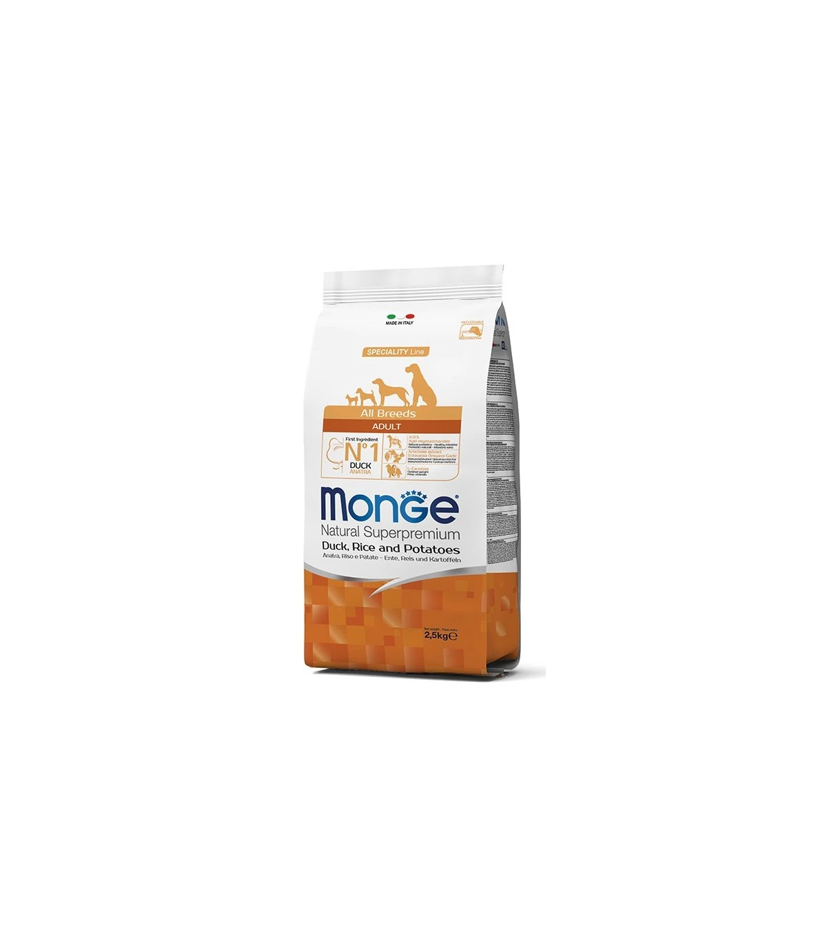 Le crocchette Monge Natural Superpremium Speciality Line Adult con Anatra, Riso e Patate sono un alimento completo e bilanciato per cani adulti di tutte le razze che necessitano di alimenti ad alta digeribilità.