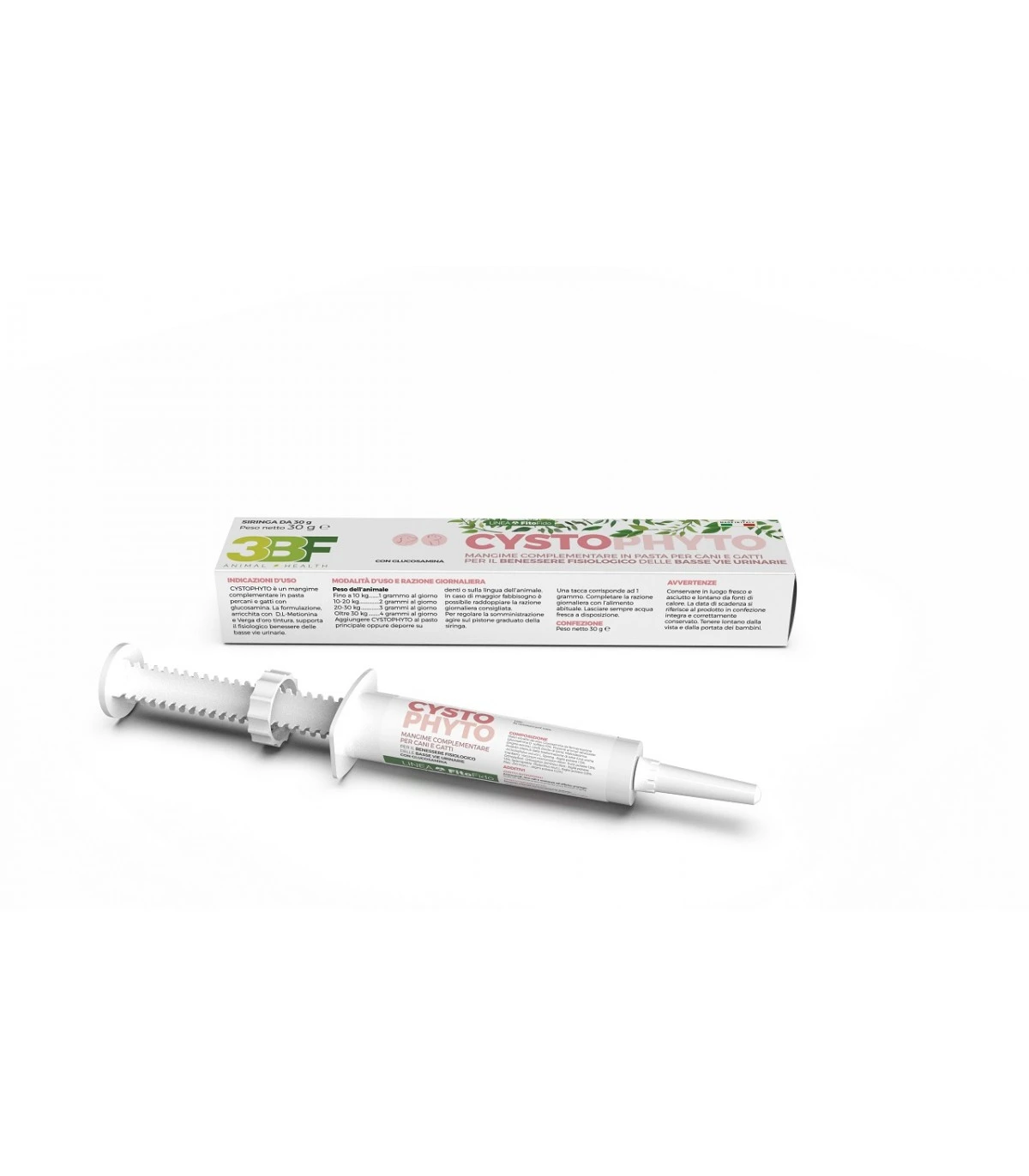 Aggiungere CYSTOPHYTO al pasto principale oppure deporre su denti o sulla lingua dell’animale. Utilizzare per 1-2 settimane. Su consiglio medico veterinario, per i primi 7 giorni, è possibile raddoppiare la razione giornaliera consigliata, suddividendo le somministrazioni con un intervallo di 12 ore, per poi proseguire con la normale razione giornaliera nei giorni successivi. Per regolare il dosaggio agire sul pistone graduato della siringa. Una tacca corrisponde ad 1 grammo. Completare la razione giornaliera con l’alimento abituale. Lasciare sempre acqua fresca a disposizione. Consultare un medico veterinario prima dell’impiego.