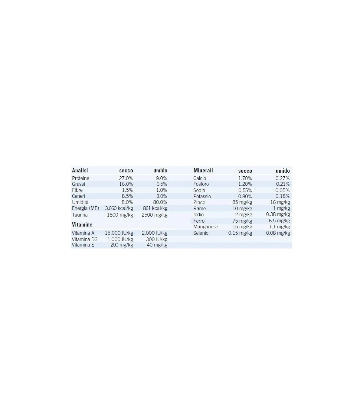 Secco: riso, agnello, proteine del riso, grasso di pollo, fegatini di pollame idrolizzati, vitamine e minerali, olio di pesce, lievito, cloruro di sodio