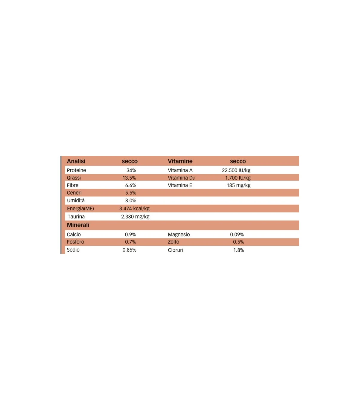 Secco: mais, uova, farina di pesce, grasso di pollo, lievito, farina di pollo, cellulosa, vitamine e minerali, krill antartico, cloruro di sodio, fibra di psyllium, polpe di bietola, fegato di pollame (idrolizzato), proteine del latte (idrolizzate), olio di pesce, estratto di lievito idrolizzato (fonte di MOS), fruttoligosaccaridi (FOS), glucosamina, condroitina solfato, estratto di thè verde.